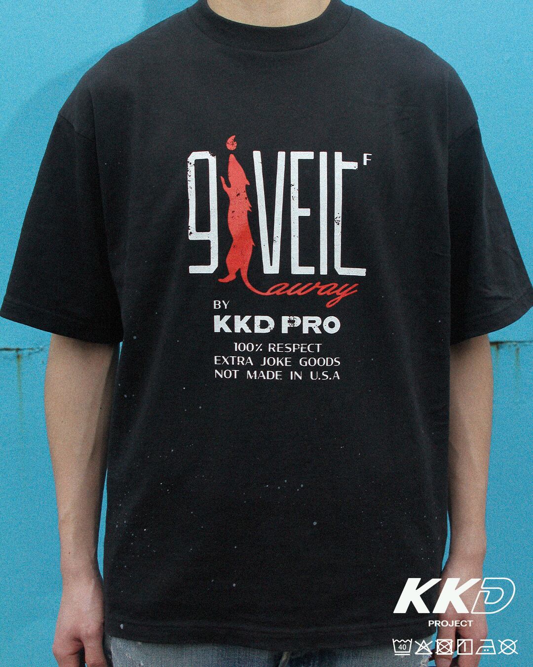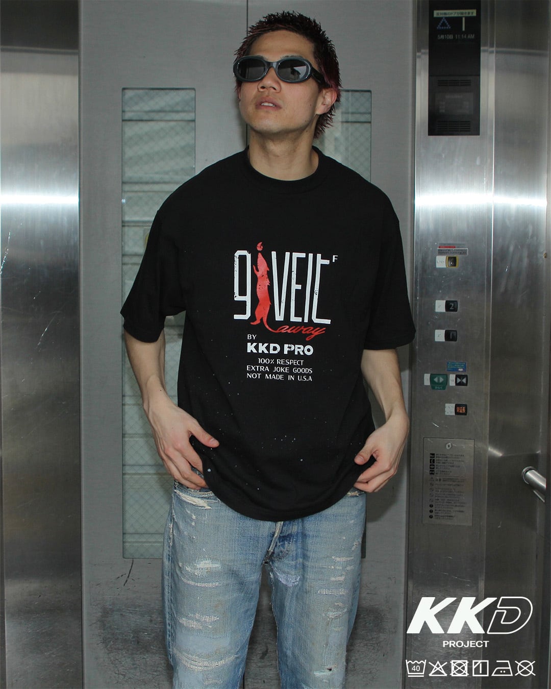 手作業によるハードウォッシュ、スプラッシュペイント。また、シルクスクリーンによるラバープリントにもクラッシュ加工を施し経年したTeeシャツの様に仕上げています。
